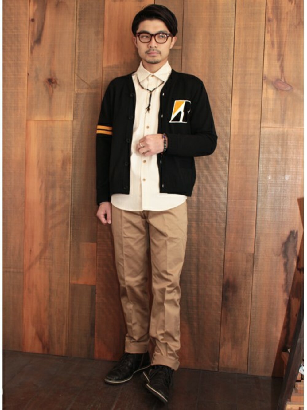 Rマークのサガラワッペンが特徴の、ROTARレタードカーディガンに、白のボタンダウンシャツ、 やや細身のテーパードチノを合わせた王道のスクールコーディネート。 ベーシックなコーディネートに、小物使いで遊び心を取り入れました。 VIVIFYのネックレスをループタイ調にアレンジし、統一感が出やすいように 同系色のブレスレットで腕元にもアクセントを。 ROTARオリジナルの眼鏡で、よりスクールらしさを。 足元はYELLOW RUBYのショートブーツでコーデ全体の引き締めました。