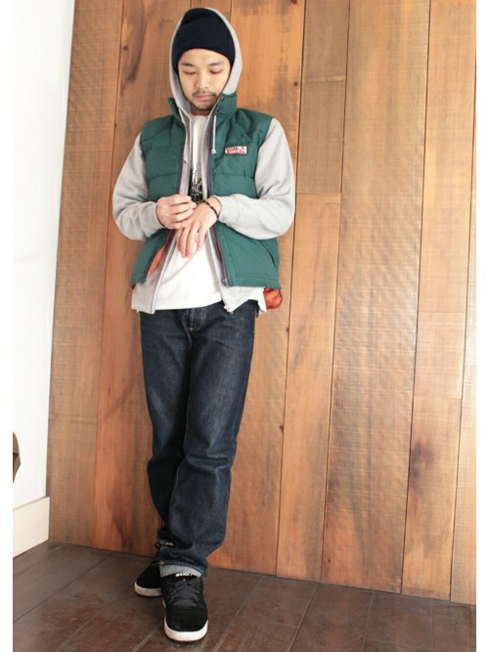 ROTARのベストにスウェットパーカーを組み合わせた定番ながら存在感のあるコーディネート。 VIVIFYのアクセで拘りのある男の印象に。