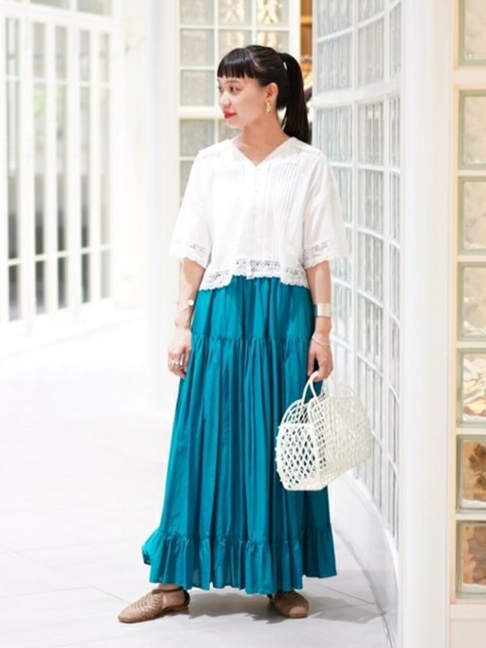レースブラウス × ティアードスカート でフェミニンなスタイリングです!プラスティックバッグはレトロな印象をプラスしてくれます!
