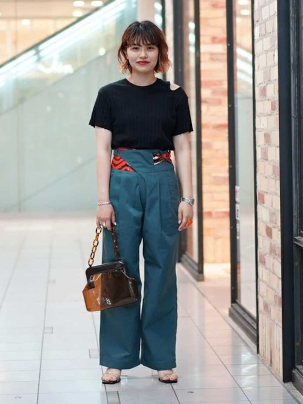 <77circa × Dickies> のワークパンツを主役にしたコーディネート。ハードなアイテムも強くなりすぎないように、小物はクリアヒールやPVC素材のバックをあわせて少しの軽さを+。