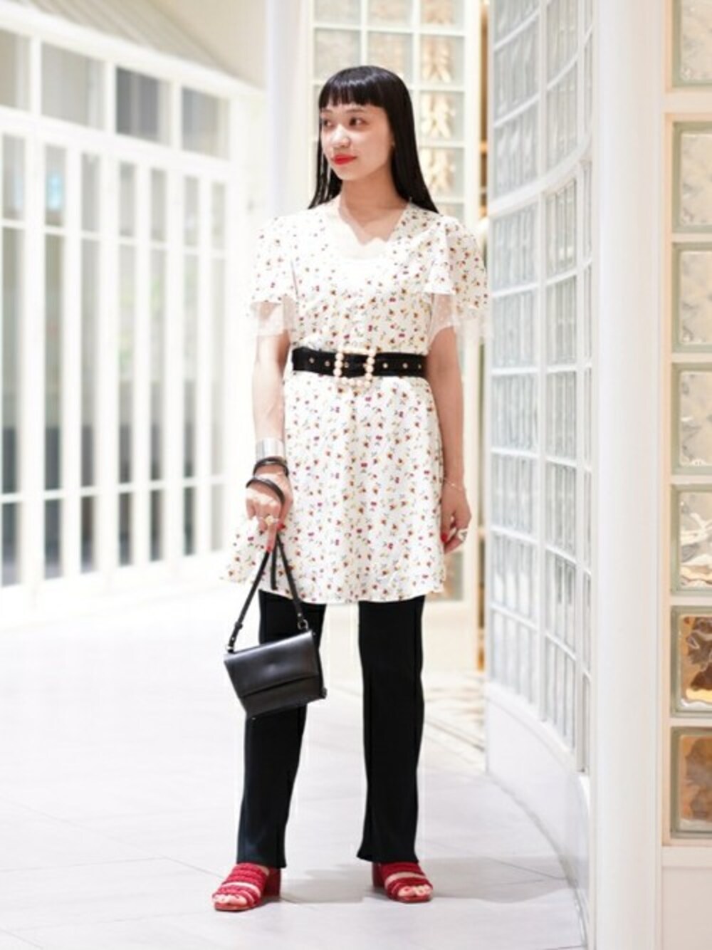 〈 sister jane 〉のワンピースは、ミニ丈が目を惹きます。パールのベルトもセットで、ヴィンテージムード漂う一着です!私はリブレギンスをレイヤードしてスタイリングしています!