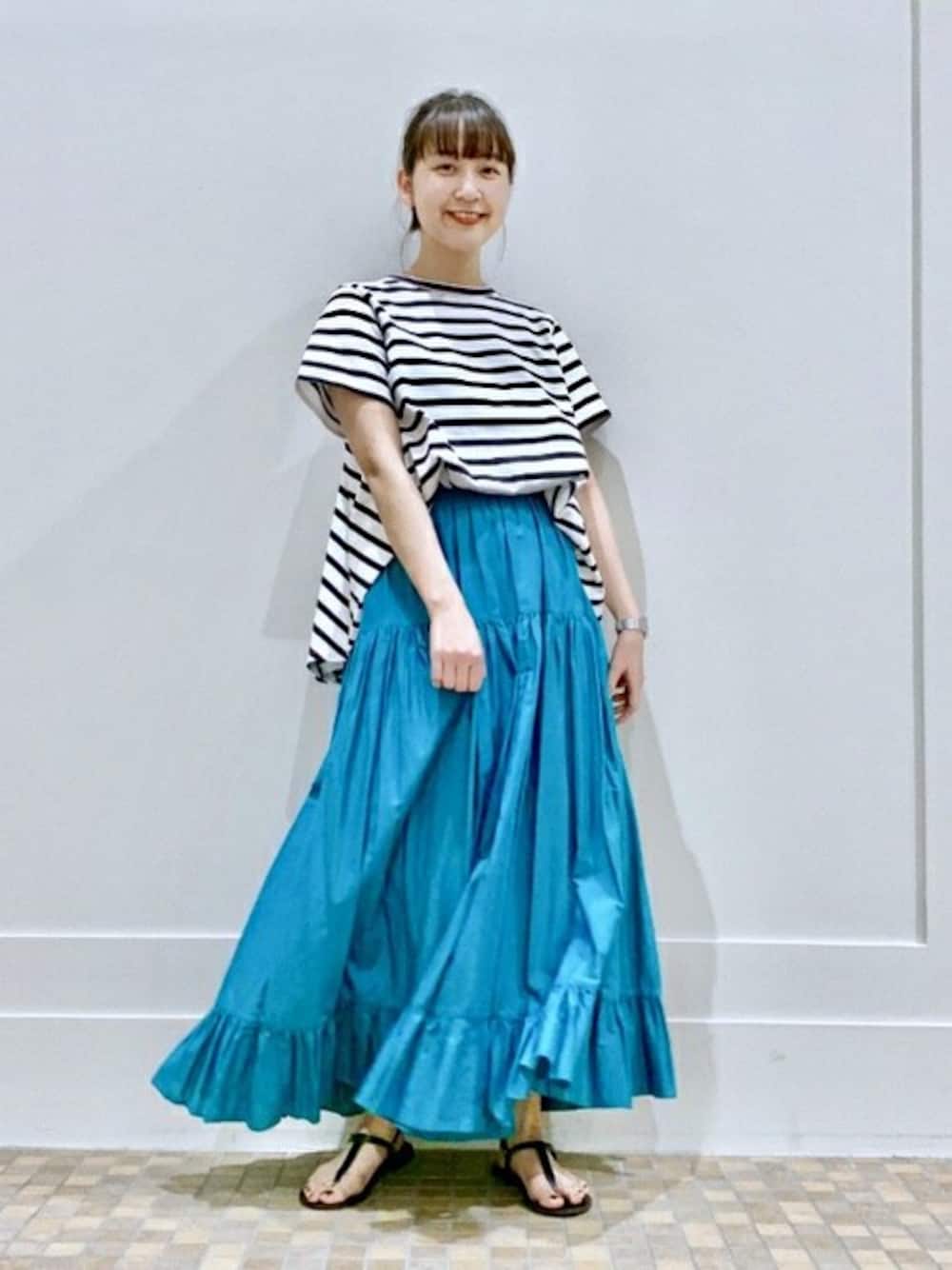 これを着て、海辺に行きたいコーディネートです^_^ 背面がフレアになっているこちらのTシャツは、首が程よく詰まっておりインナーが見える心配もなく着用いただけます! Tシャツがシンプルなので派手カラーのスカートを合わせました!夏ですね!^_^