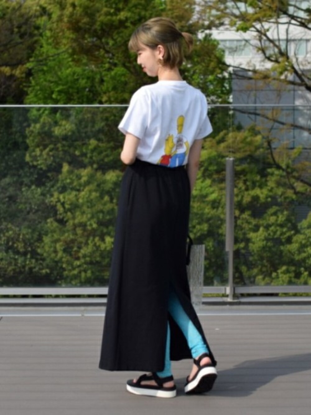 【WEB限定】の<TEVA>は軽くてお気に入りです♪Tシャツ素材で全体をカジュアルにまとめて、レースレギンスでフェミニンさをプラスしました。 THE SIMPSONS TM & © 2019 Twentieth Century Fox Film Corporation.All Rights Reserved.