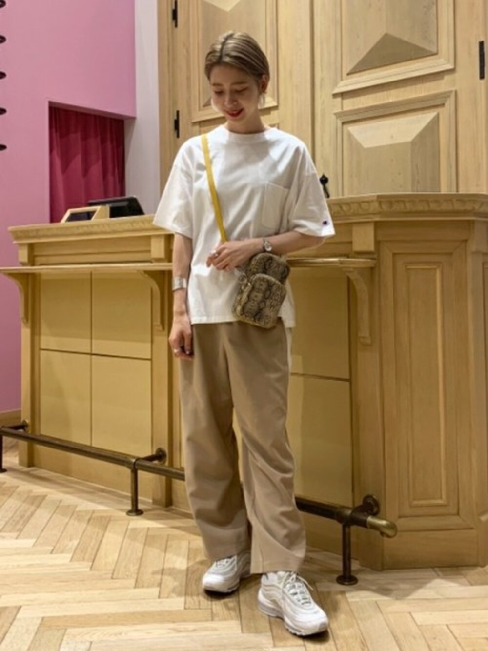 一見シンプルなスタイリングですが、 パンツはラインパンツ、靴やピアスの小物を 白で揃えて統一感を出しました。 新作のバッグはトレンドのパイソン柄! スタイリングのポイントに是非!