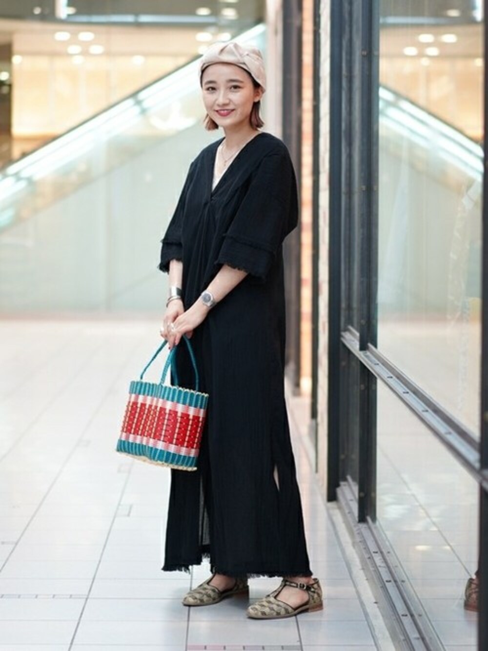 バックスタイルが可愛いヨウリョウワンピースに合わせて被るだけでターバン風になる帽子を。カラフルなカゴバッグを差し色にしています。