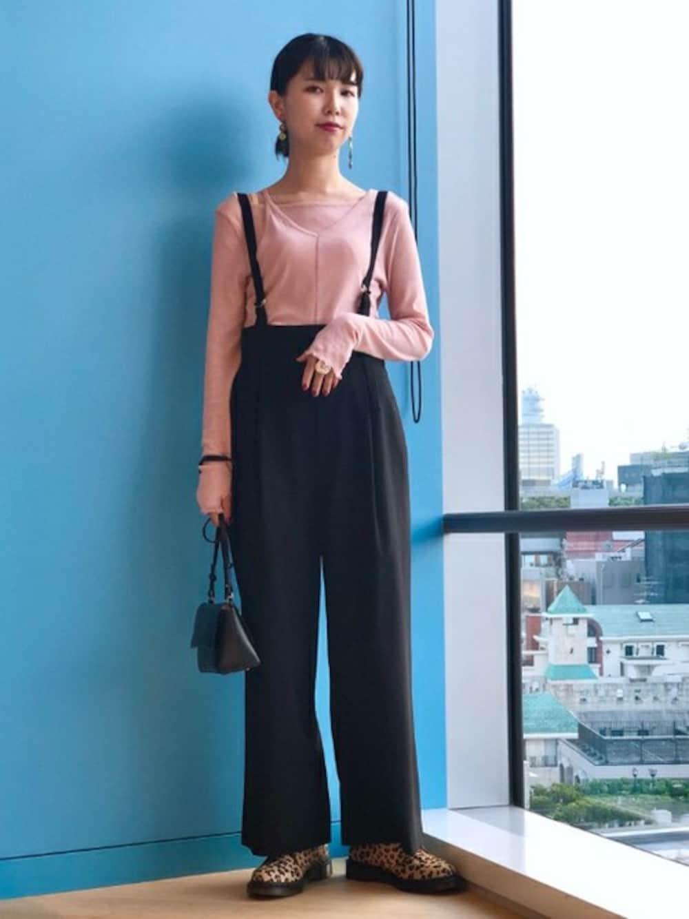 シルエットが美しいハイウエストパンツをメインにコーディネート。シンプルすぎないように、アシンメトリーとレオパードでトレンドをプラスしました。