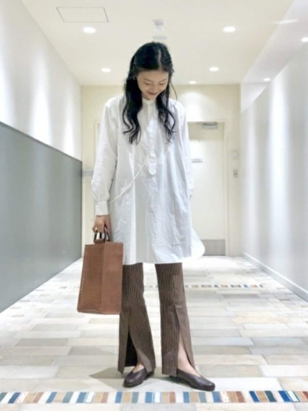 チェックのパンツの色に合わせてブラウン系の小物でまとめました。