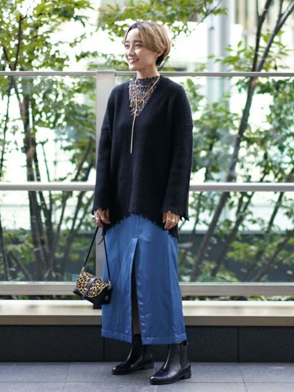 サテンのスリットスカートは鮮やかなブルーカラーがおすすめです。ダメージニットにはトレンドのレオパードを合わせました!