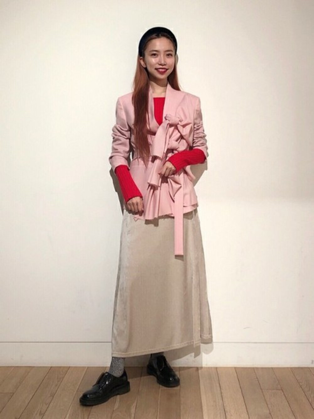 大好きなベビーピンク×レッドの組み合わせでコーディネートしてみました!こちらのジャケットは今季イチオシのアイテムです。