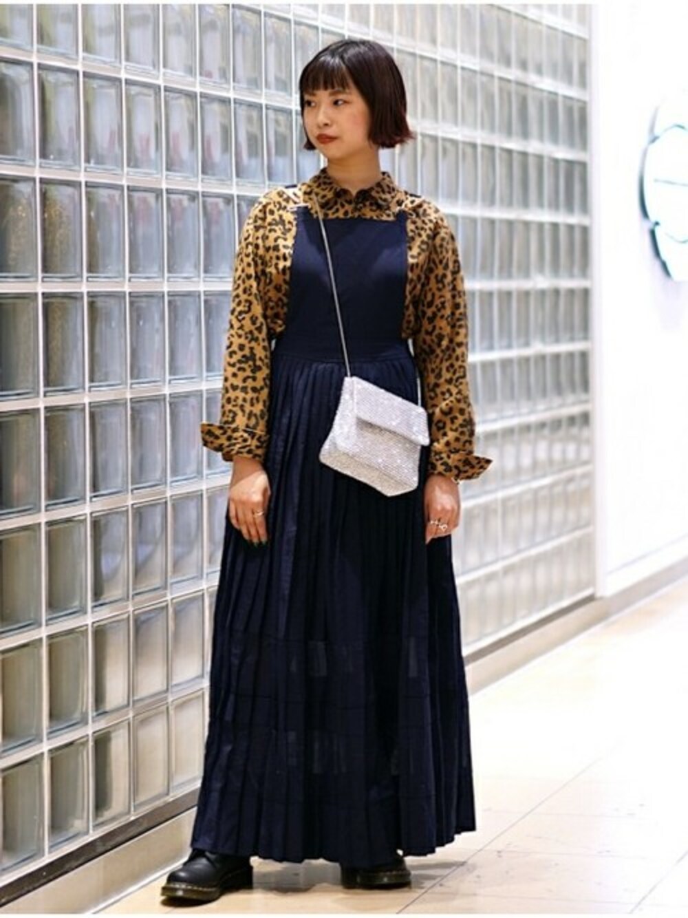 GHOSPELLのユニフォームマキシワンピースをレオパードシャツと合わせて少し音楽の雰囲気を出しました!足元はもちろんDr.Martensです。胸元の金具デザインもポイントです!