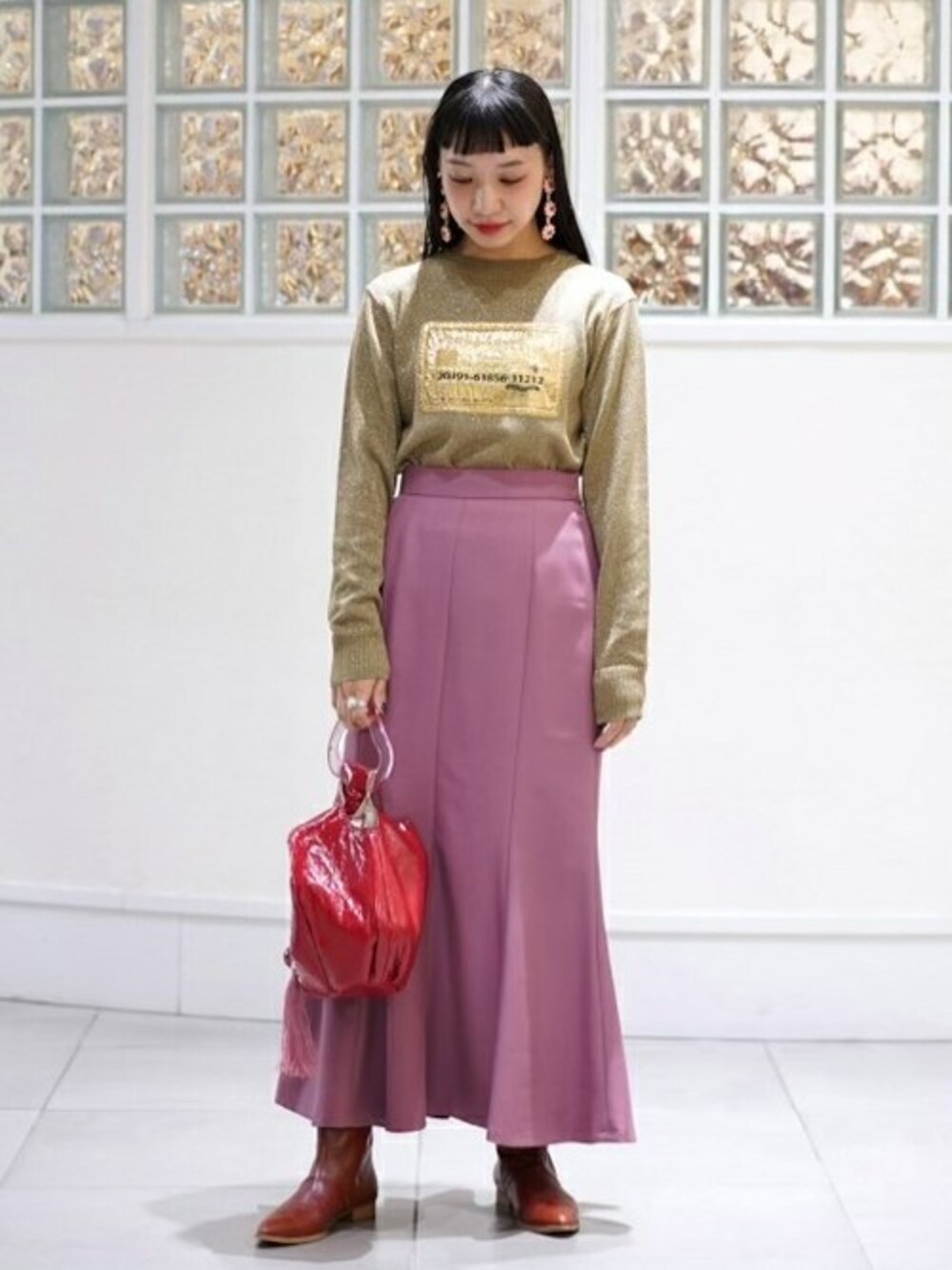 新作のマーメイドスカートを主役にしたスタイリングです。ラメニット、ビジューイヤリングを合わせて、カジュアルな中にエレガントな印象をプラスしました!