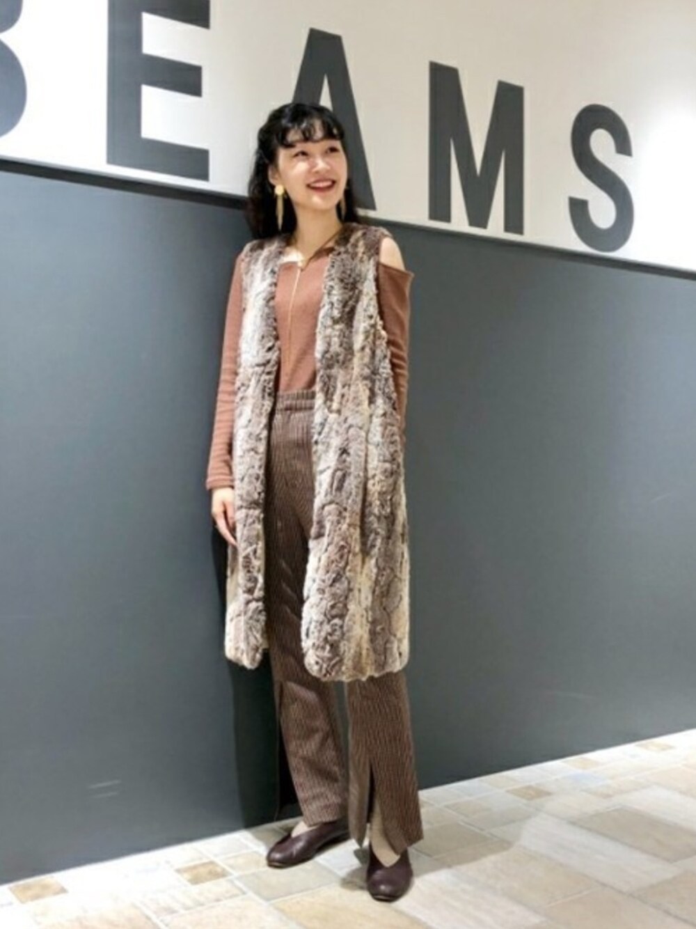 ブラウンでまとめ、アクセサリーはゴールドで。ファーのジレと肩出しトップスで温度感のバランスをとりました。
