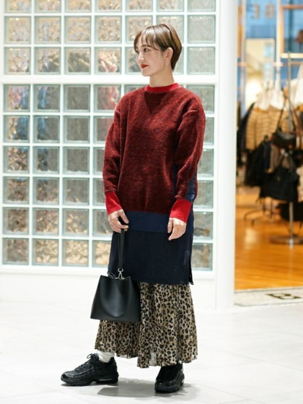 重めのレイヤードバランスですが、動きのある素材を合わせてバランスを取りました。<NIKE>のエアマックスをプラスし、ストリートミックスなコーディネートです。