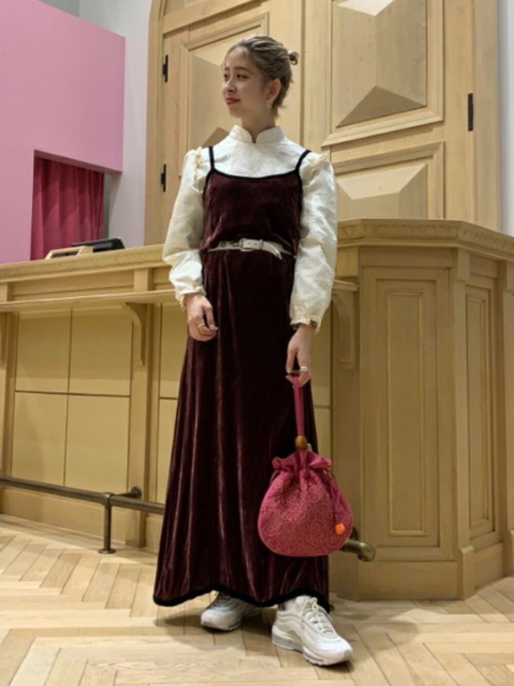 sister janeのチャイナブラウスを ワンピースとレイヤード。 ベルトやシューズはブラウスと色を合わせました。