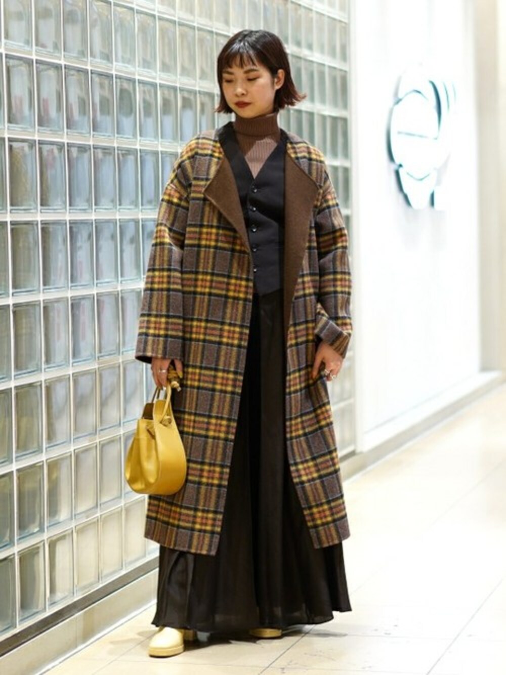 オールブラウンでのコーディネート。チェックのアウターはリバーシブル仕様!小物はベージュで纏めて全体的にレトロな雰囲気にしました。