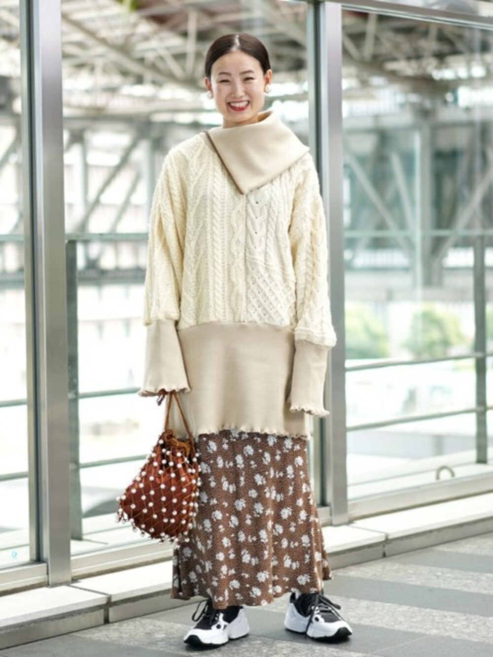 〈77circa〉のボリュームニットをあえてロングスカートとスニーカーで重たく合わせました。