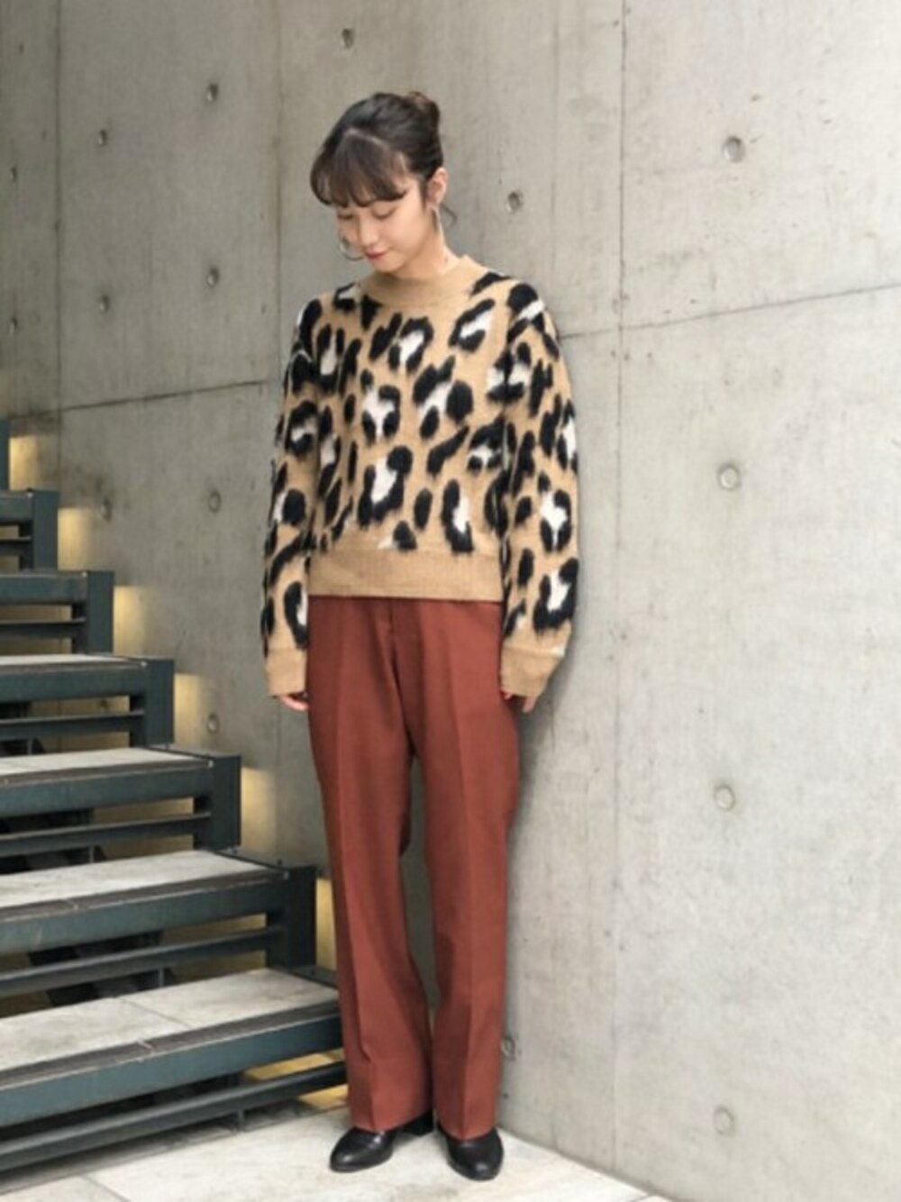 <Ray BEAMS >のレオパード柄ニットをメインにスタイリング。全体的にブラウンでまとめ、大人っぽい印象になるよう意識しました。