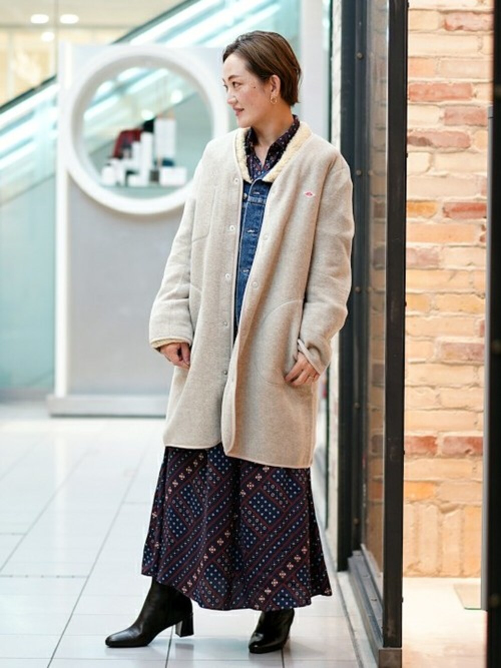 <DANTON>のフリースシリーズのコートバージョンのスタイリングです。何回も言いますが(笑)、軽くて暖かいのでレイヤードスタイルにはマストなアイテム!!今回は、ワンピース、デニムジャケットの上に羽織ってみました。一つ一つはオーソドックスなアイテムですが、重ねるだけで雰囲気が出ますよね。アイテム各々の長短を活かしたコーディネートです◎