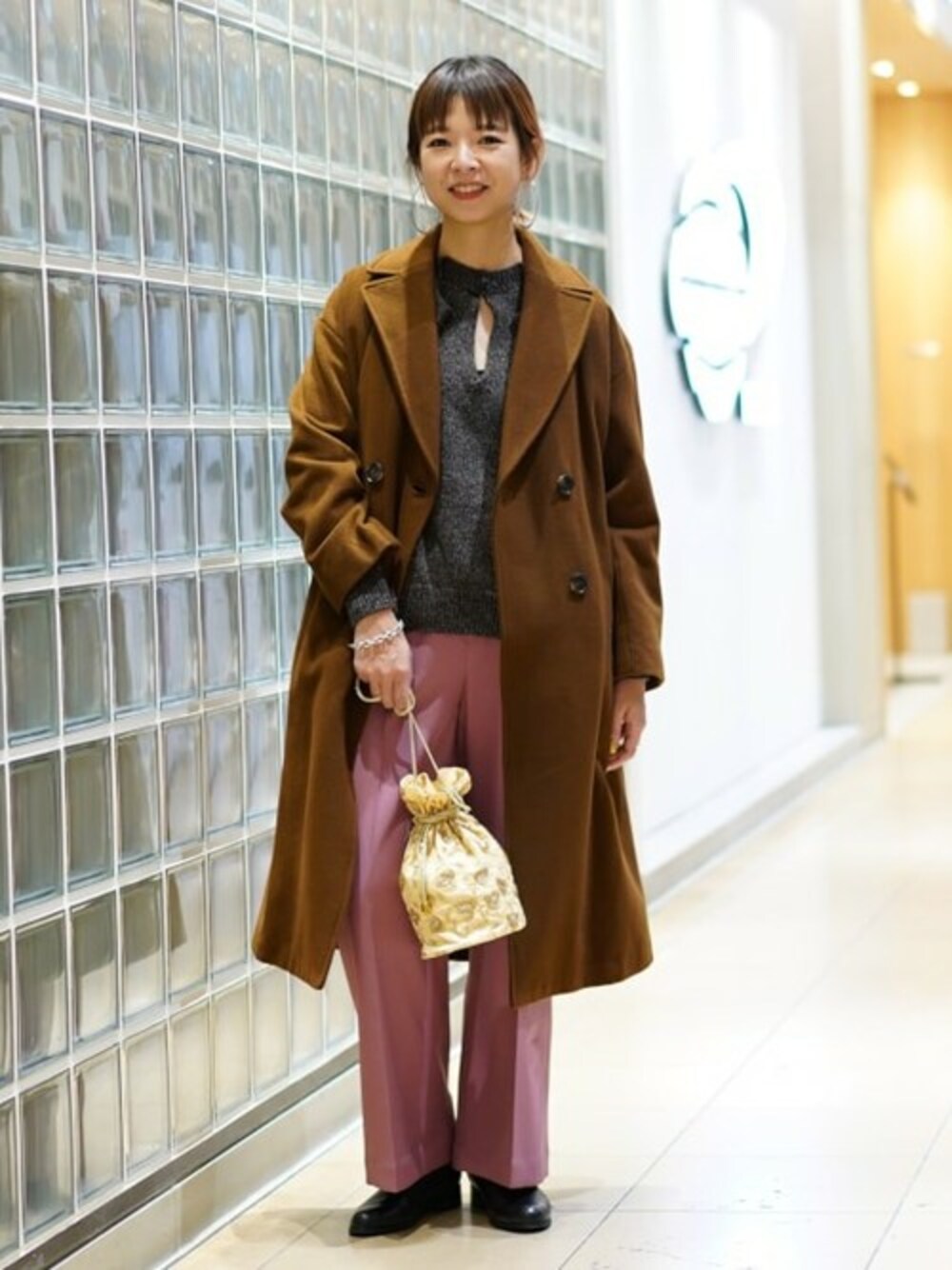 デザインが可愛いニットを主役に、ピンクとブラウンの組み合わせで温かみのあるコーディネートにしました。