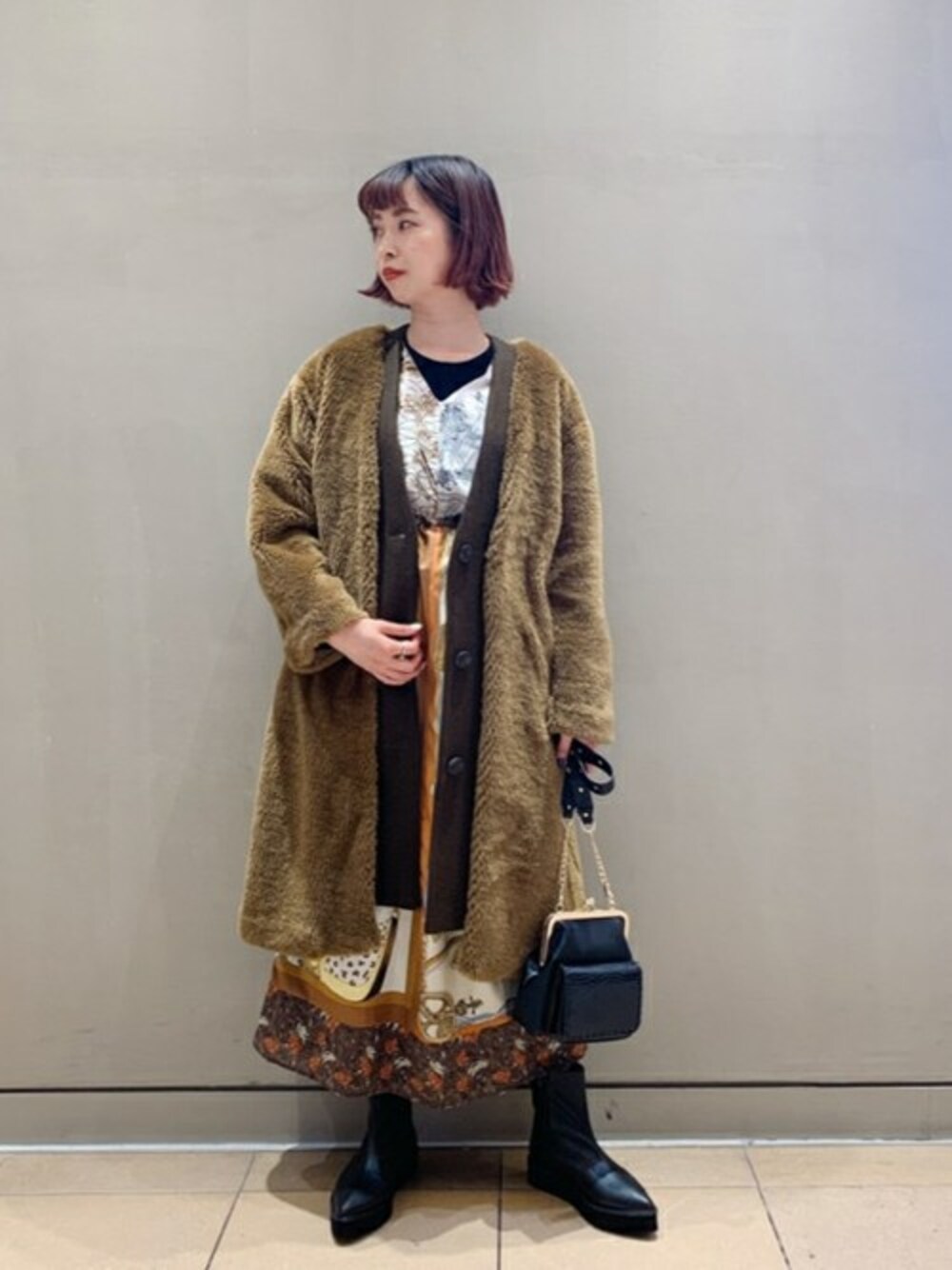 ヴィンテージのスカーフを使用したワンピースをメインにコーディネート☆ Ray BEAMSオリジナルのエコファーのアウターがすごくマッチしました!