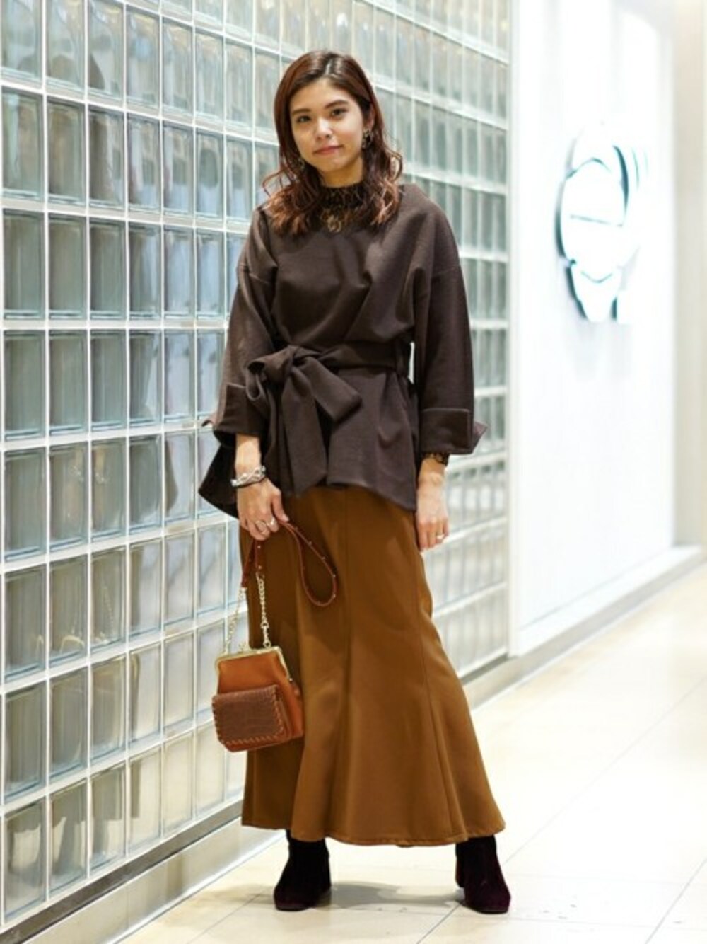 トーン違いのブラウンを組み合わせてメリハリをつけました。マーメイドラインのスカートで更に女性らしさを◎