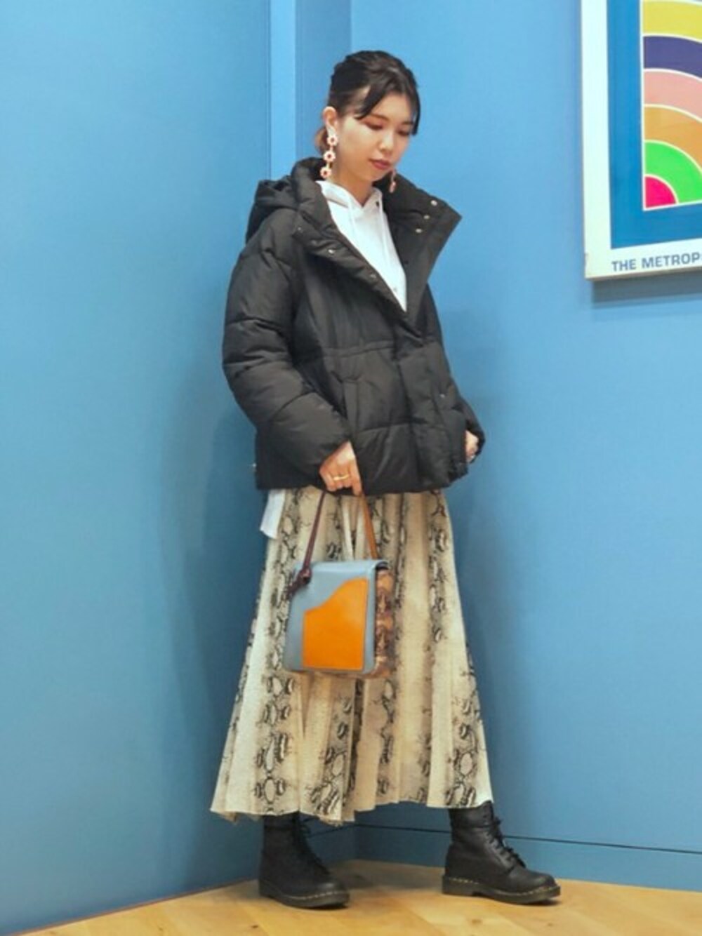 モノトーンコーデはパイソンでアクセントを!大ぶりピアスでちょっとゴージャスに。