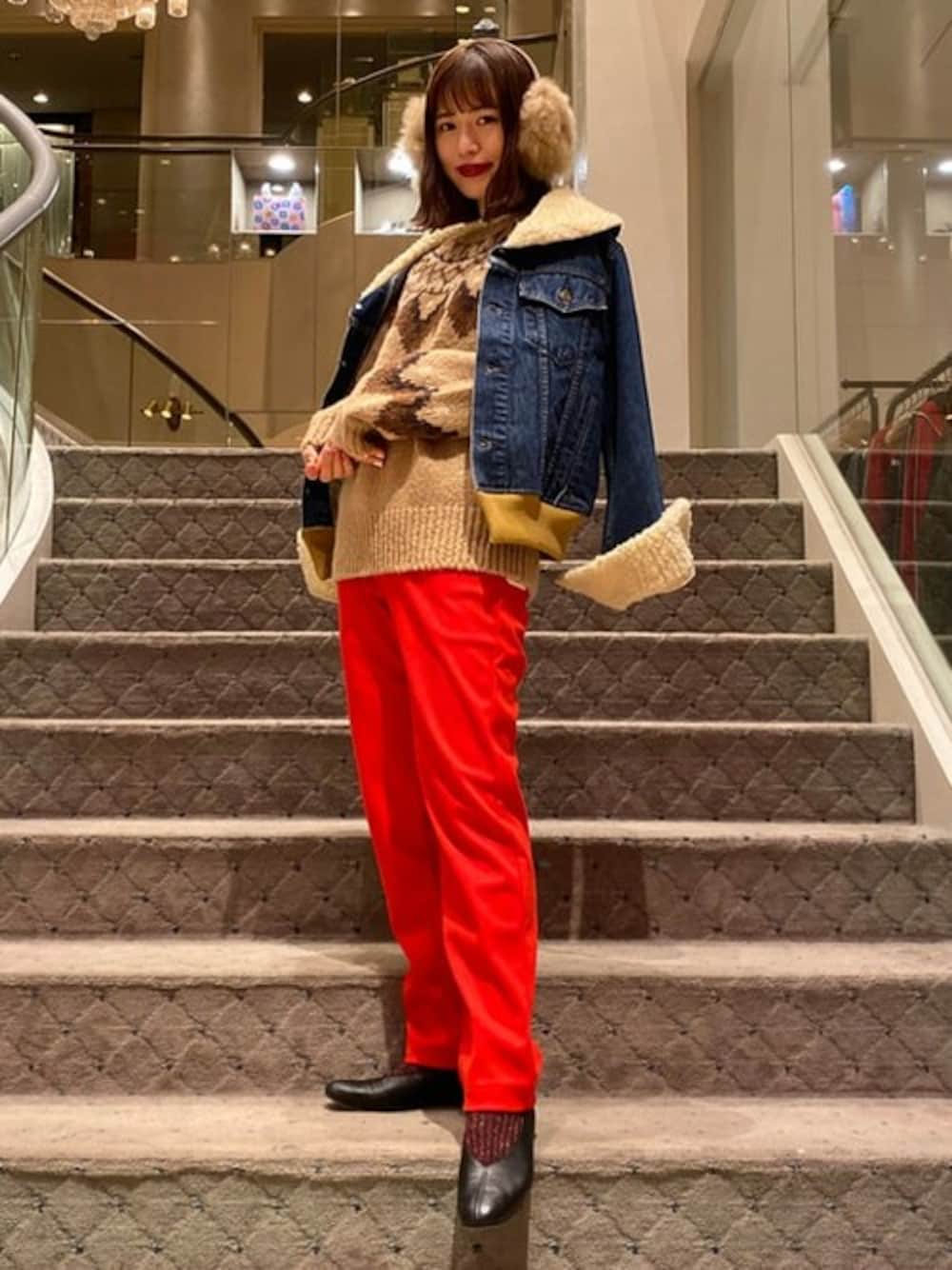 今年大人気のRay BEAMSのニットを着てみました。一枚で贅沢に柄が入っているとアウターの袖を通したくなくなりますね、、。<sister jane>の発色が綺麗なパンツを合わせ、カラーでメリハリをつけたスタイリングです。 イヤーマフラーもモフモフでとっても暖かくて心がぬくぬくします、、。