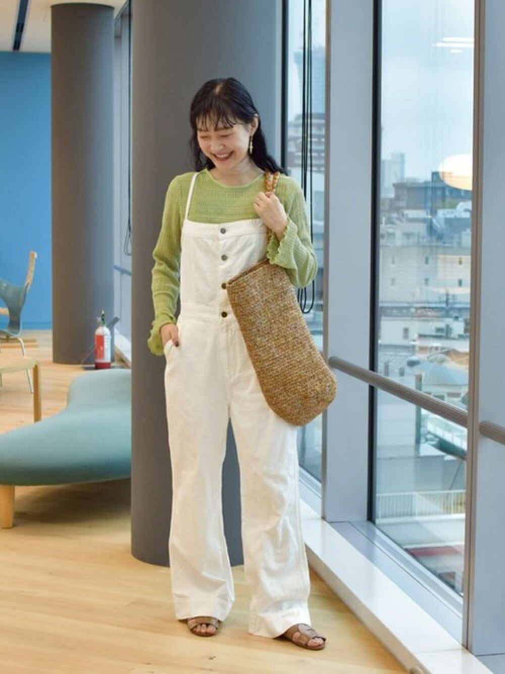 20SS Ray BEAMSキーカラーはピスタチオ!白のデニムサロペットによく映えて可愛いです。カゴバッグの中身はサンドイッチがいいですね〜♡