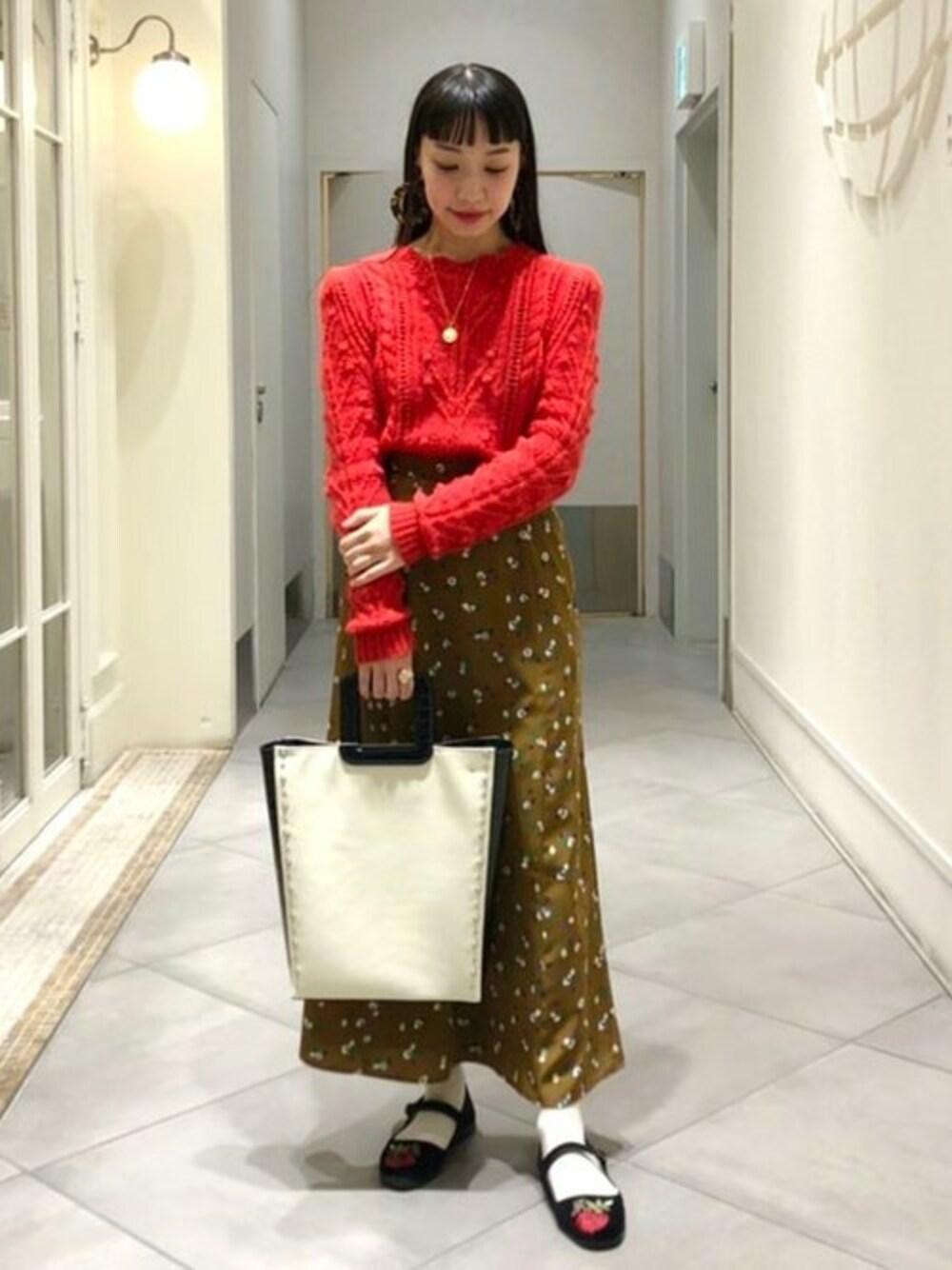 レトロなスタイリング。コインネックレスは長めのチェーンで今のニットを着る時期にも着用して頂き易いです!