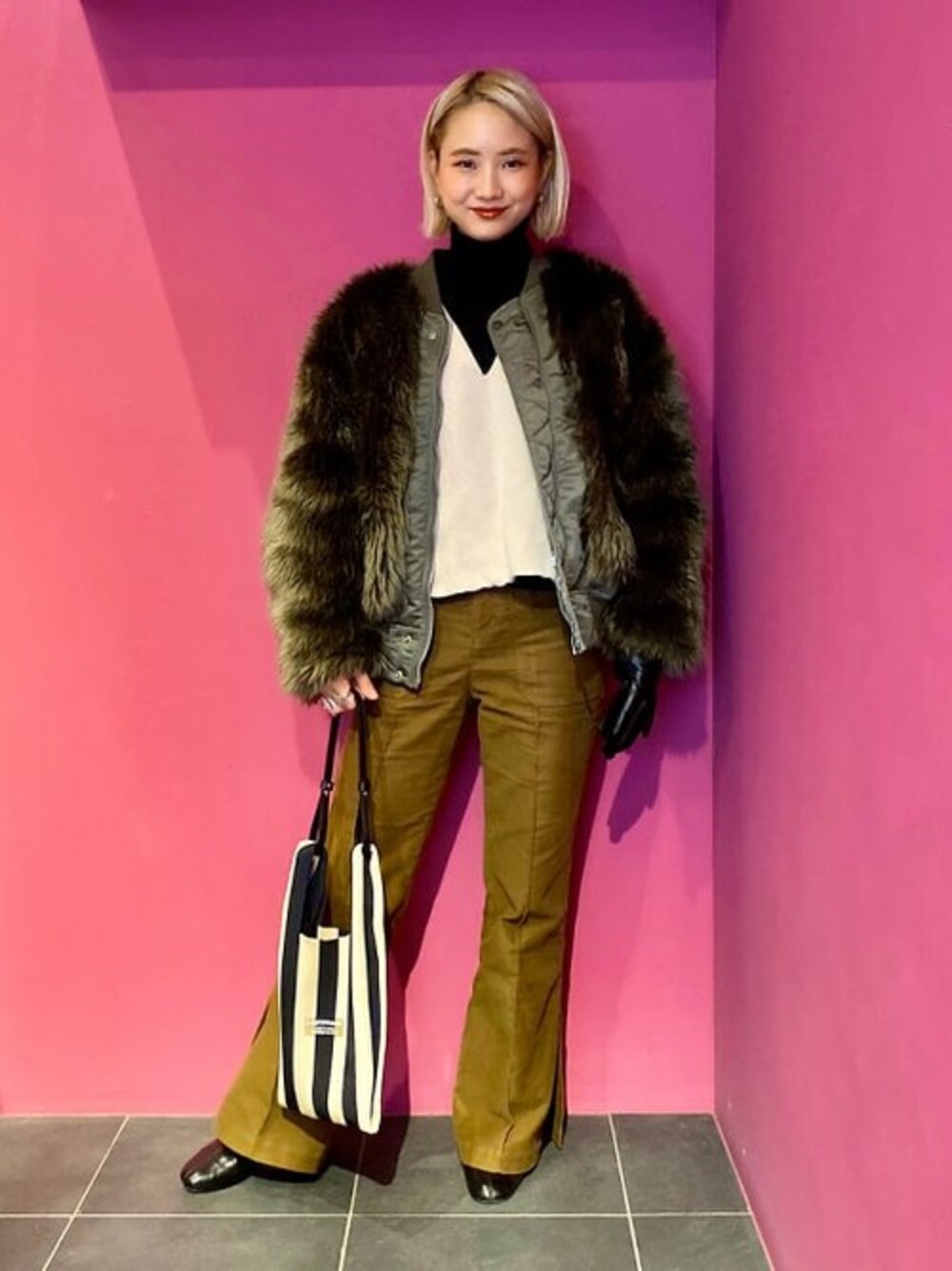 リバーシブルで楽しめるのアウターをファーを表に向けて着用。カジュアルなデートシーンを連想してスタイリングしてみました。
