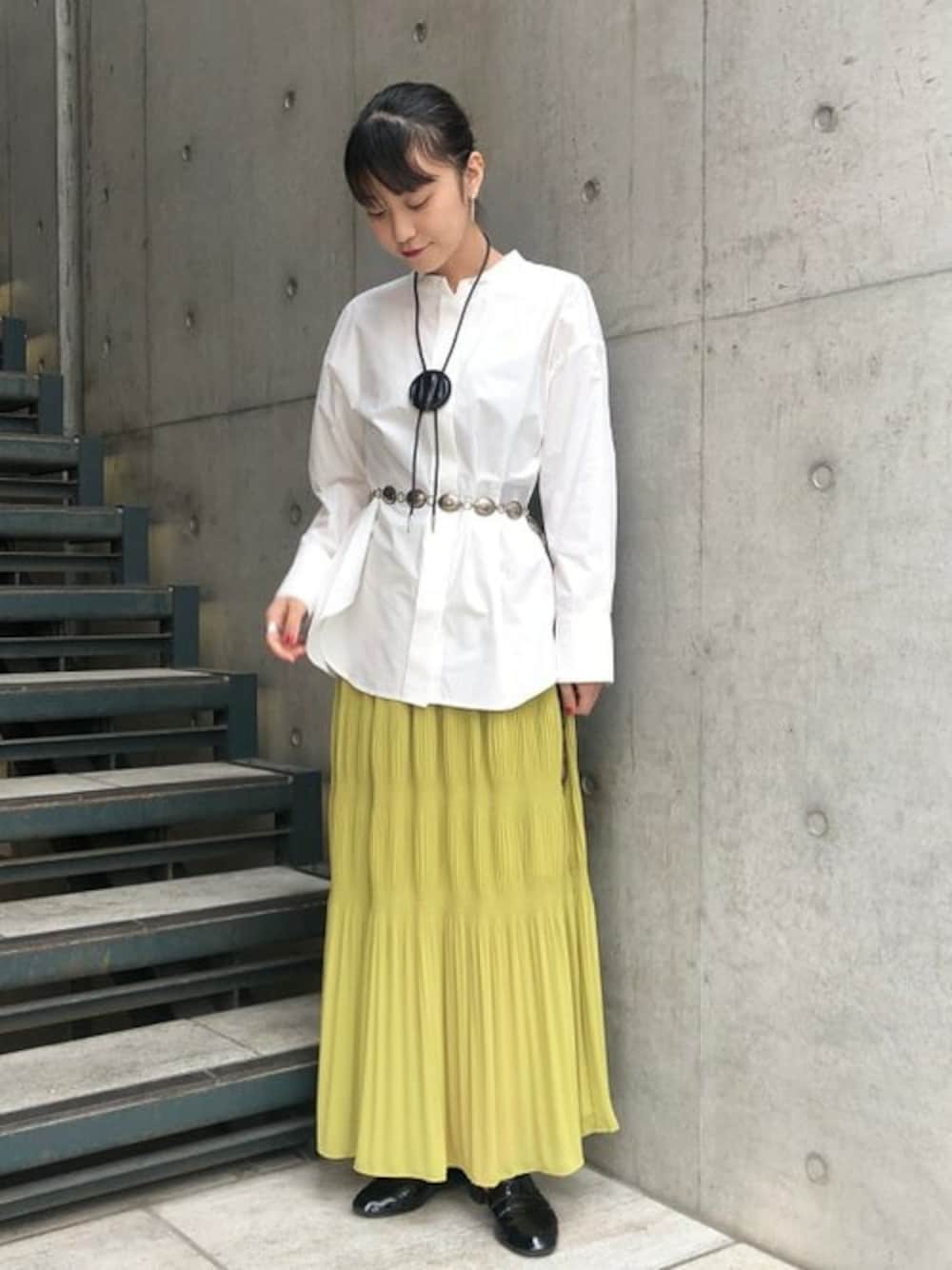 サフランイエローのカラーが魅力的な。<Ray BEAMS> マジョリカ プリーツ スカートをメインにスタイリング。