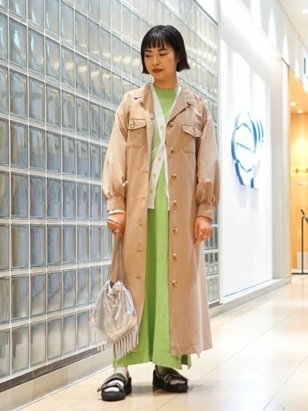 ライトグリーンを基調に春カラーのスタイリング。TOGA PULLAのワンピースの上にサファリシャツワンピースを羽織るだけだとシンプルなので透け感のあるカーディガンをレイヤードしてバッグもメタル素材を用いて一癖付けました。