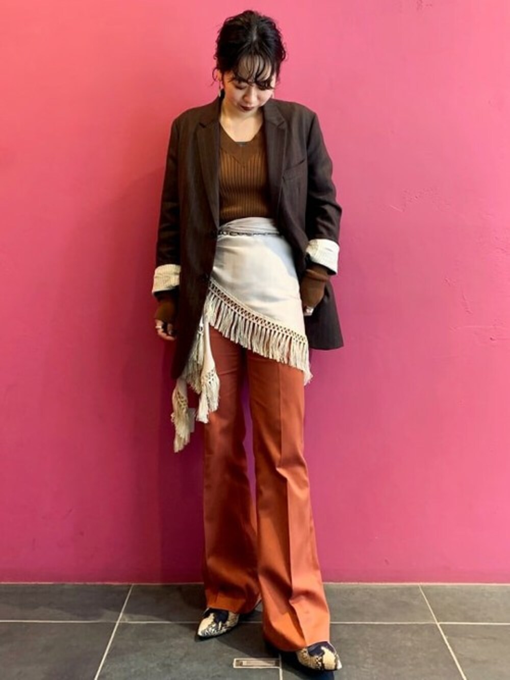 フリンジのストールを腰巻し、足元にはウェスタンブーツを合わせボヘミアンテイストに。インディアンジュエリーのベルトをウエストに重ねているのもポイントです。