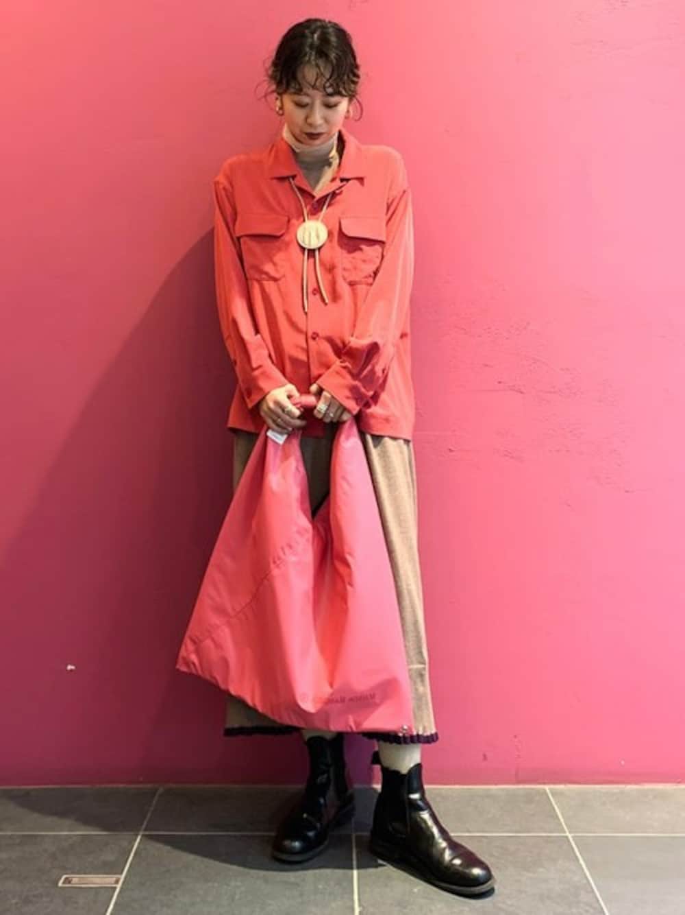 素材や色の異なるピンクでまとめたスタイリングに。首元は今シーズントレンドのシースルースカーフとループタイで合わせたのもポイントです!