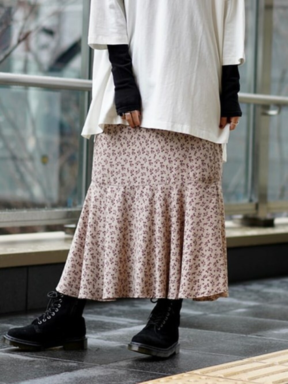 春らしいカラーのフラワープリントスカートはマーメイド型で広がりすぎず、ボリュームのあるトップスと合わせるのもオススメです。