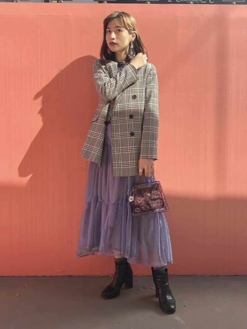 ワンピースに合わせてイヤリングも春らしい透けるイメージで!引き締めポイントでチェックジャケットとヒールブーツを合わせたのもポイントです!