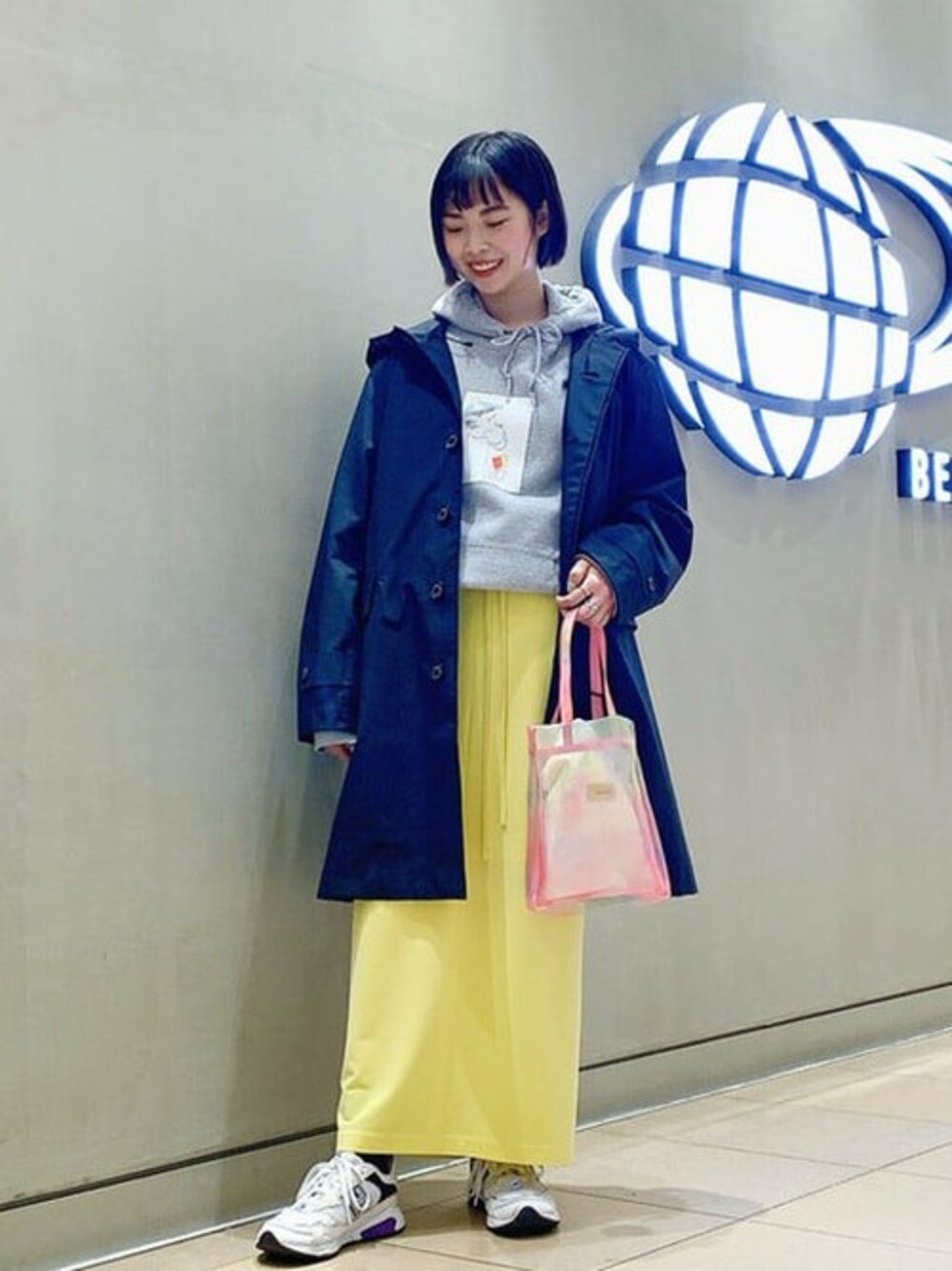 春らしいイエローのスカートを購入!タイトなシルエットで女性らしい印象なので、トップスはラフにフード付きのスウェットを!アウターはTHE NORTH FACEのもの。黒のアウターを羽織っても、スカートの鮮やかなカラーでバランスが取れます。