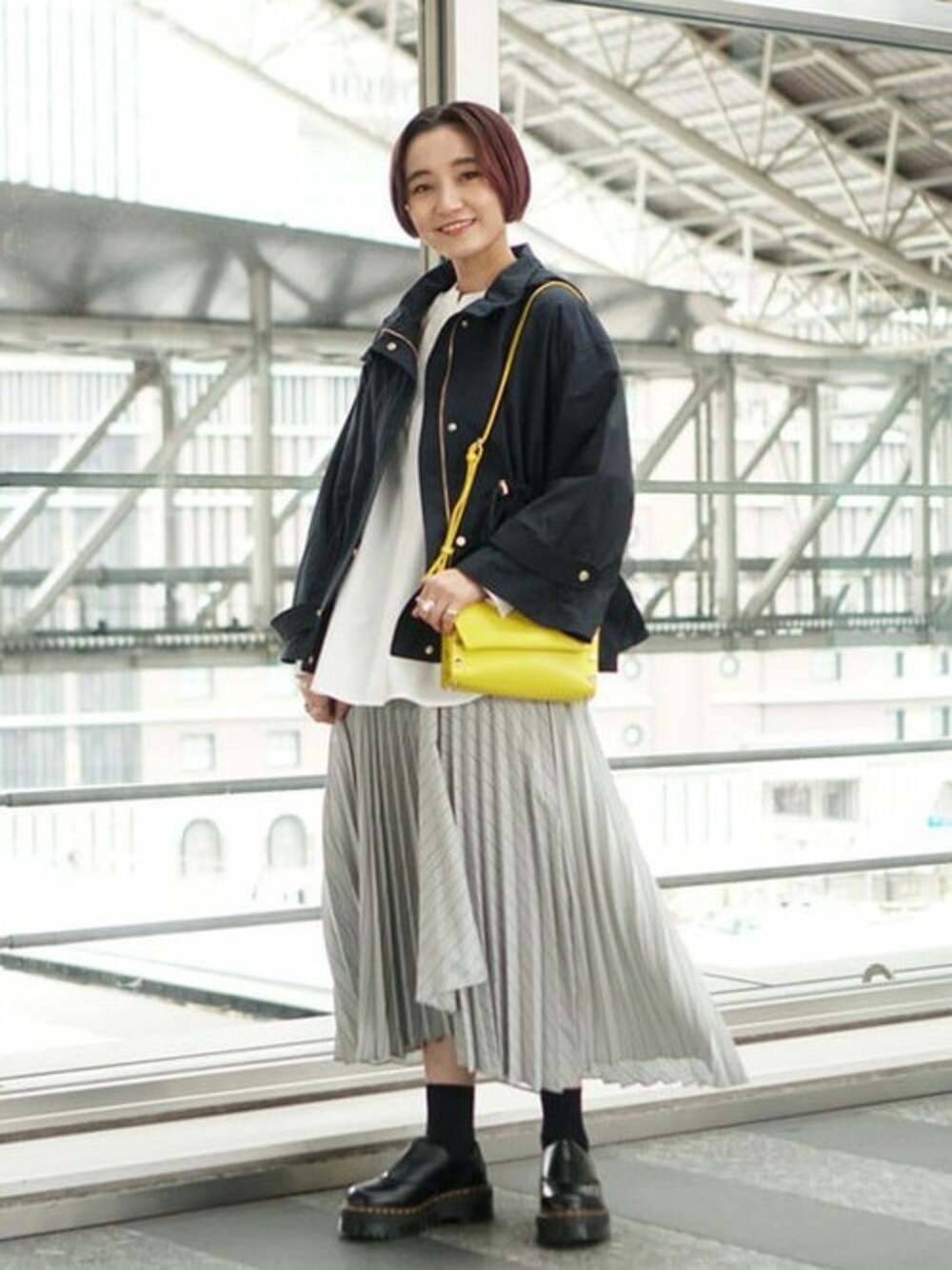 ストライプ柄のプリーツスカートをメインにすっきりとしたコーディネートです☆★ブルゾンは今の時期にも羽織りやすくてオススメです!