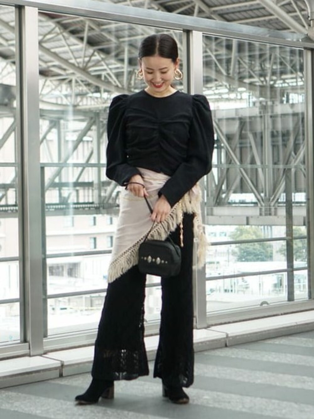 勇気を出してウエストにフリンジストールを巻いてみました。トップスに存在感があるので他はオールブラックで。