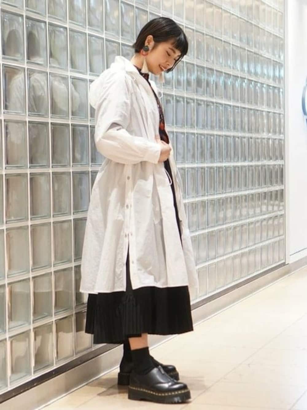 ブラックベースのコーディネートにホワイトのアウターを羽織りました!若干透け感があり、サイドのデザインがポイント!