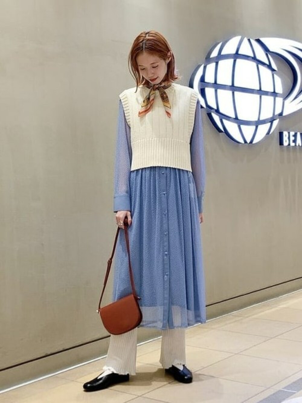 大好きなブルーとオレンジでスタイリングしました。白を足すことで春らしく爽やかに。ベストはあえて短めな丈感が可愛いです。