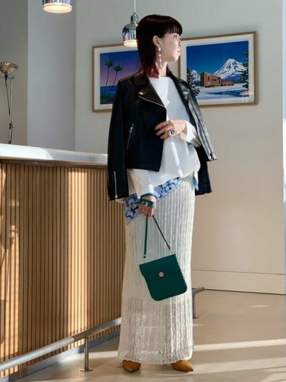 こないだのコーディネートにアウターをプラス!柔らかくまとめたスタイリングだったので、レザーブルゾンでメリハリを付けました。