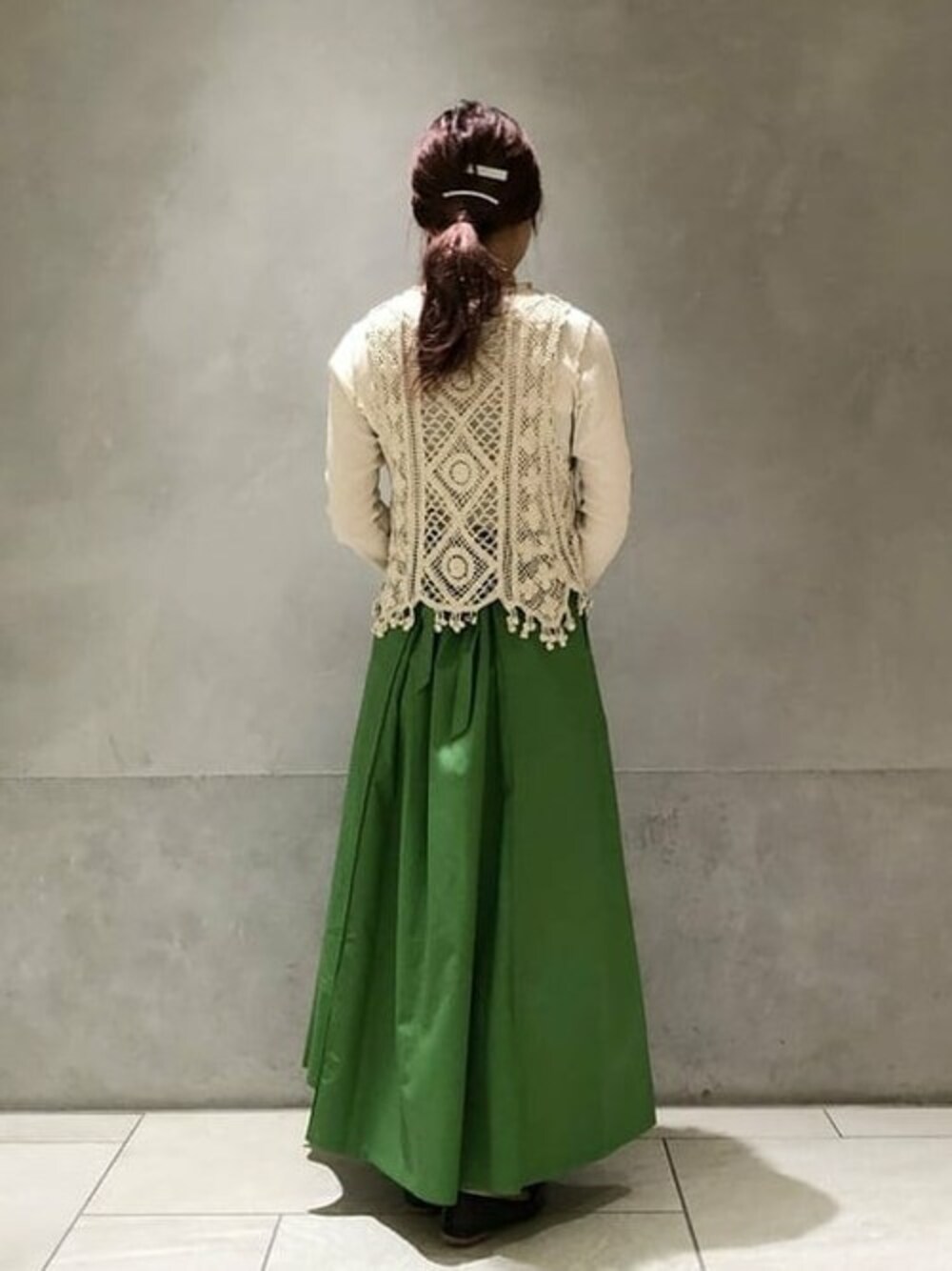 目を惹く鮮やかなグリーンのスカートを主役に、<MODERN BOHEMIAN>を意識しました。フリンジ・セミシアーと今季の<Ray BEAMS>のキーアイテムをギュッと詰め込んだスタイルです。