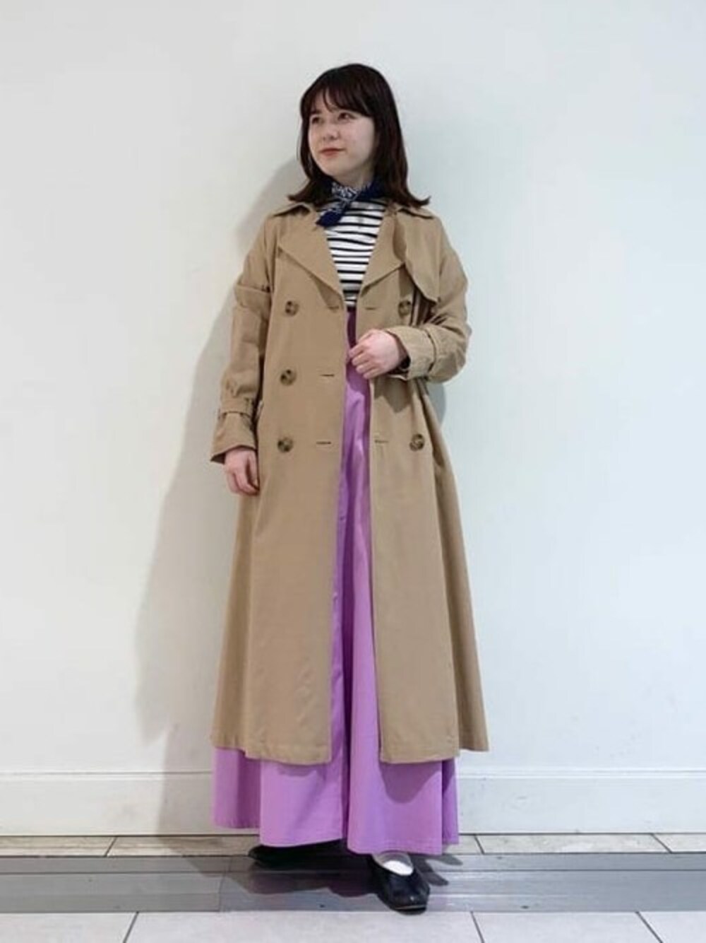 春らしいパープルのスカートを主役に、他はシンプルにまとめました!スカーフ使いは今年のキーワードにもなっています!