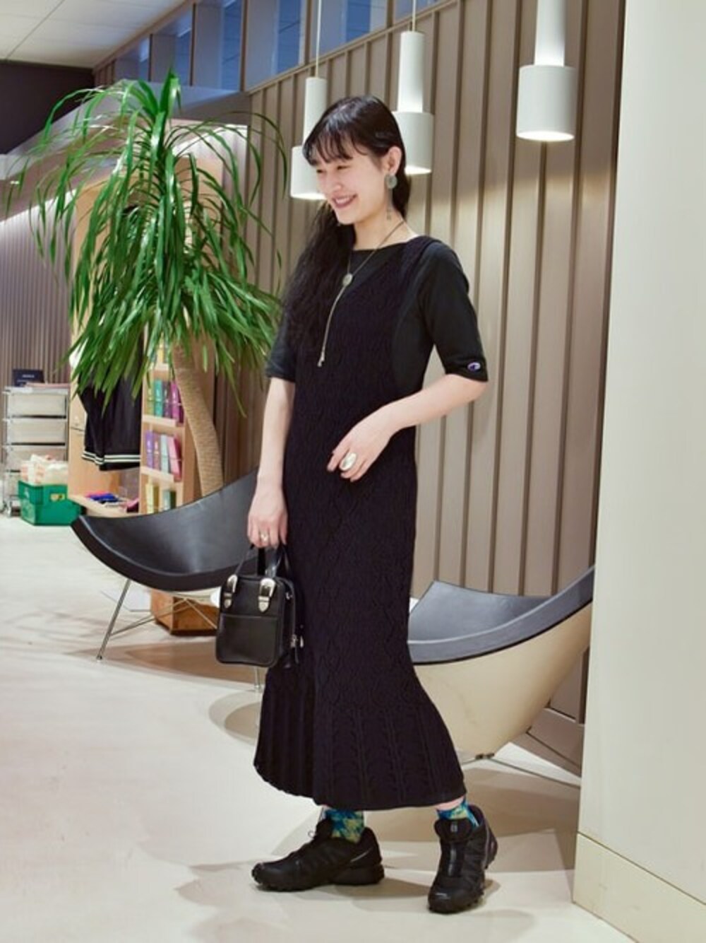 オールブラックですが、クロッシェ編みワンピースをレイヤードしたりして女の子らしさを取り入れました。今季はコンチョアクセが注目です!!