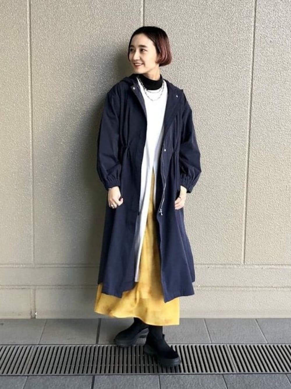 ネイビーのコートに鮮やかなイエローのタイダイ柄ワンピースを合わせました♪