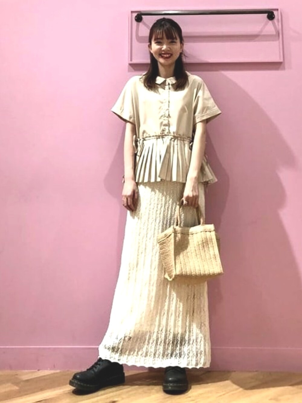 毎年人気のプリーツシャツにタイトなシルエットのクロシェ編みスカートを合わせてみました☆
