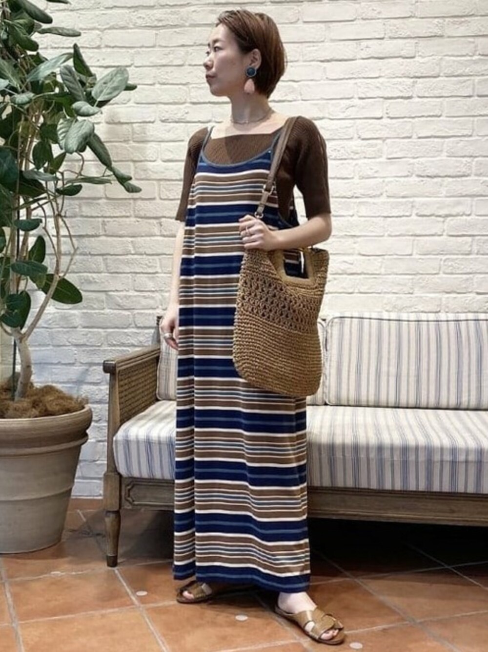 色を統一し、イヤリングのピンクを挿し色にしました。カゴバッグを合わせるとリゾート感が出ますね。ニットの袖のデザインがたまらなくツボです。