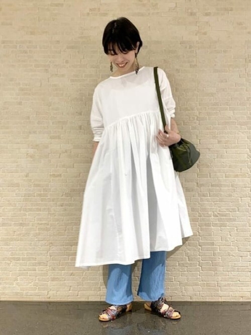 <MARMARI>からギャザーたっぷりのワンピース入荷してます。サンダルとピアスで夏らしいボヘミアン要素をプラスしました。