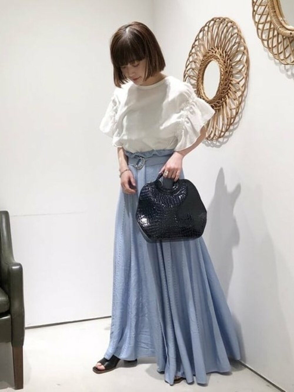 【Ray BEAMS】毎シーズン大人気でのフリルスリーブTシャツを大人っぽく合わせてみました。 水色のパンツなので、同系色のネイビーのバッグで統一感を意識しました!